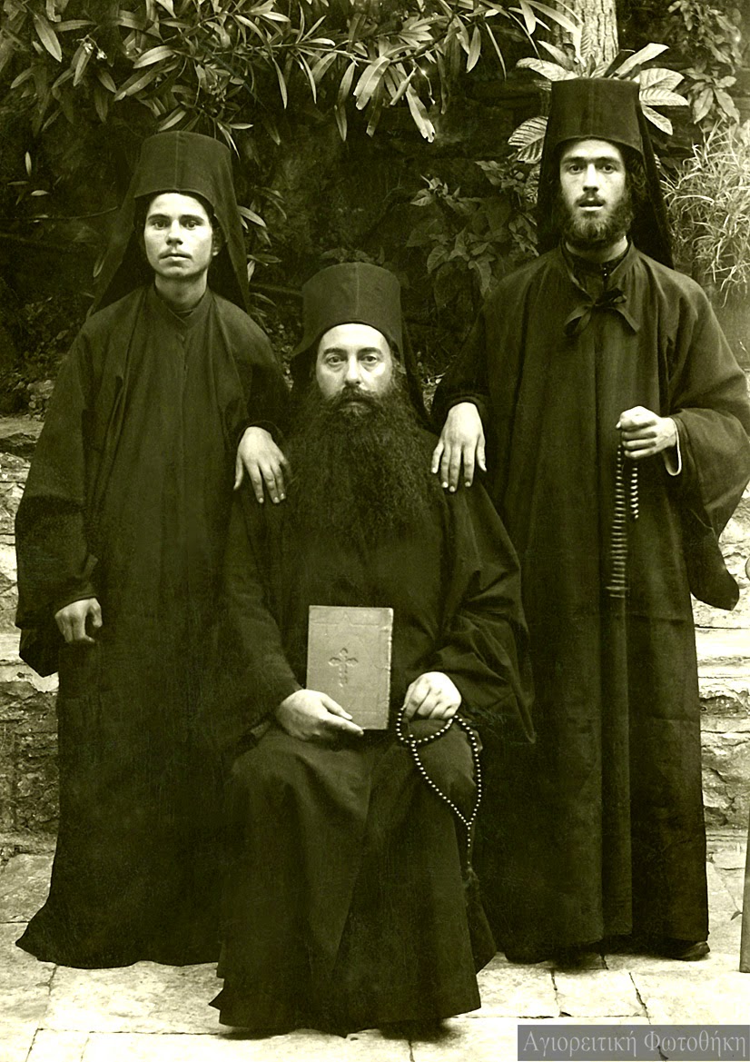 | Άνθιμος ιερομόναχος Αγιαννανίτης (1913-1996), ως νέος μοναχός (αριστερά), με τον μοναχό Θεόφιλο (δεξιά) και τον γέροντά τους μοναχό Γαβριήλ (†1959) |